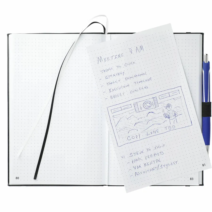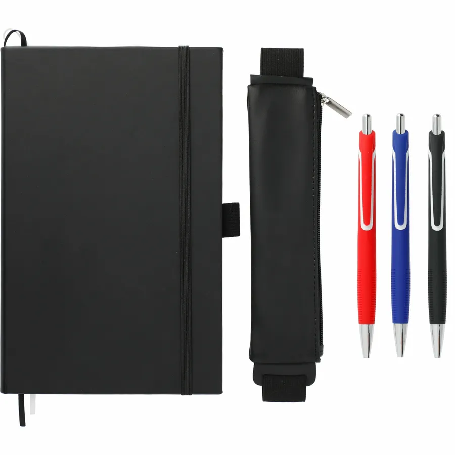 The 5.5 x 8.5 FUNCTION Bulleting Notebook Bundle Set includes the 5.5 x 8.5 FUNCTION Bulleting Notebook and zippered pen pouch with three gel pens: black, red and blue with color-matching gel ink. Its the perfect notebook for staying organized. Features a square, cornered hard-bound cover with color-matching elastic closure and pen loop. Double ribbon page markers. 80 sheets of perforated dotted and numbered pages.