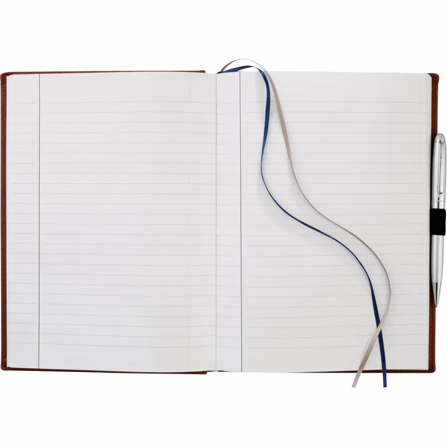 The 7 x 10 FSC Mix Pedova™ Large Bound Journal is a hardcover bound journal featuring Italian UltraHyde construction. It contains 125 sheets of FSC Mix white lined paper with built-in ribbon page markers to help hold your place between uses. This stylish notebook also features an elastic pen loop, with pens available to order separately.