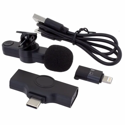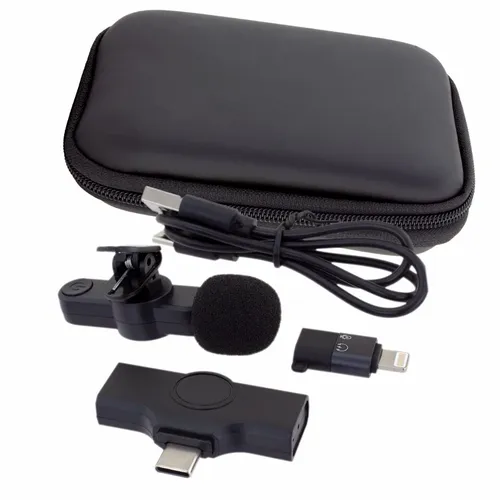 This is a breakthrough wireless microphone with real-time transmission and synchronization. Designed to be user-friendly for video vloggers, content creators, interviewers, and lecturers. The microphone consists of a transmitter and receiver that will automatically connect. Just clip the wireless microphone on a shirt collar or lapel and plug the receiver into a compatible smartphone device. No need for a third-party app or wireless connection.