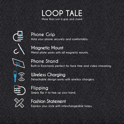 Easily attach a Loop Tale to steady and secure your phone grip. Customize the Loop Tale's back plate with a full-colour print to bring alive your brand's story. Swing out the attached metal ring to easily recline your phone vertically on flat surfaces. Excellent for pairing with magnetic car mounts. Metal parts slide apart with ease from the Loop Tale's base for safe wireless charging.