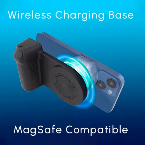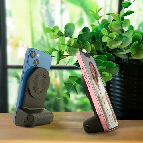 A camera grip-inspired design that brings comfort and stability to video and photo capturing. Simulate the feel of a camera grip with the ClikGrip phone holder. Magnetically attach to newer smartphones with MagSafe tech. Comfortably capture precious moments with the wireless-enabled shutter button. Plug in the ClikGrip and charge compatible wireless charging phones. It's a convenient phone stand for the office, at home, or while traveling for business.